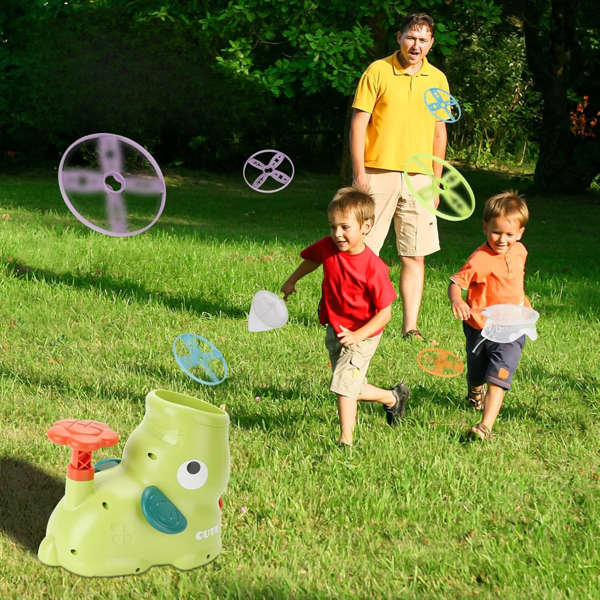 Den innebygde katapulten sender frisbeen høyt opp i luften med bare ett trykk, noe som gjør hvert kast spennende.